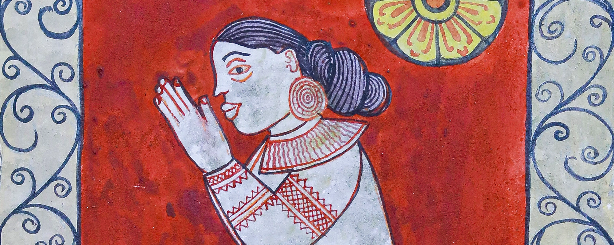 The painting depicts the meeting between King Vessantara and King Chetiya, with a leela (playful act) greeting King Vessantara. Drawing inspiration from this traditional painting, the artist has incorporated lotus flower motifs and greetings, adding a unique design element to the artwork.